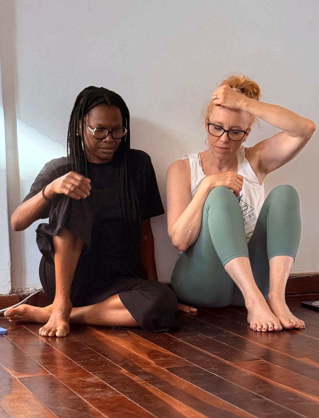 After class, Vera sits on the floor of the studio with her longtime student, friend and fellow studio owner Aileen beside her.
